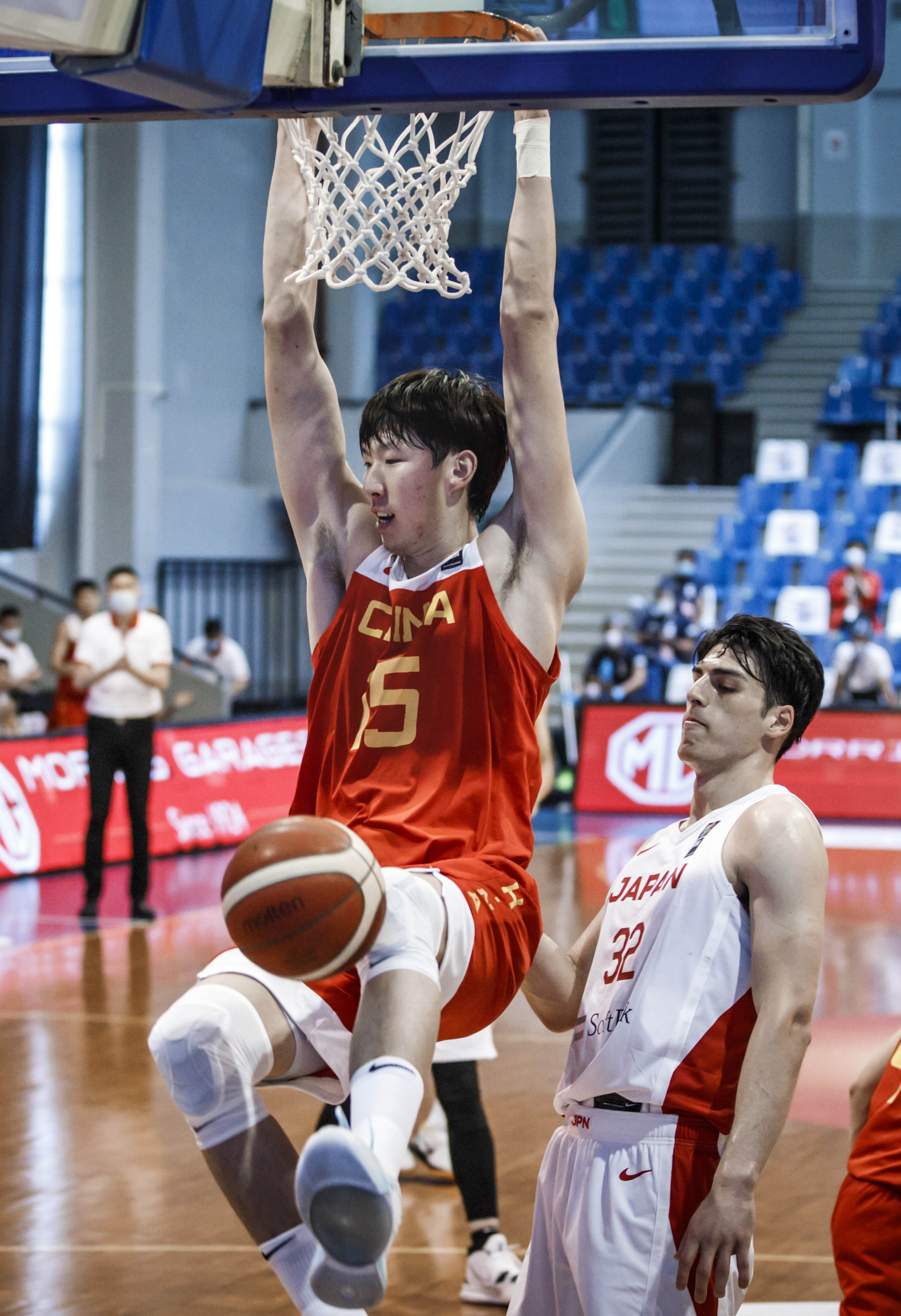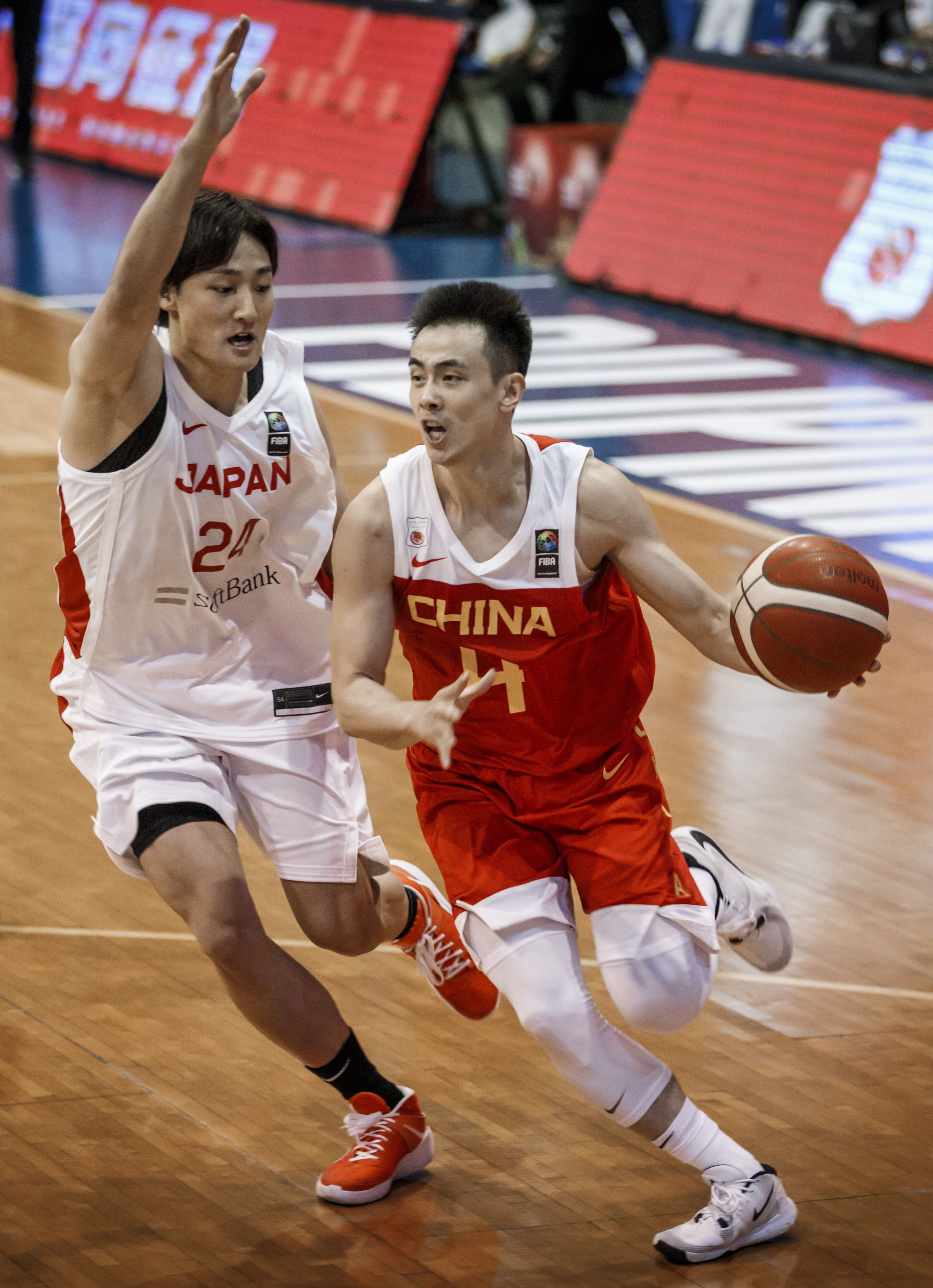 第二节,中国队扩大防守范围,限制对手外线投篮机会,日本队则对中国队内线球员采取包夹防守的策略,场上局势一度陷入胶着。中国队以41:45落后结束上半场。