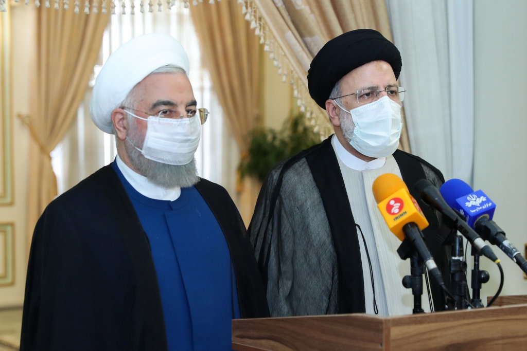 6月19日,在伊朗德黑兰,易卜拉欣·莱希(右)和现任总统鲁哈尼对媒体讲话。新华社/路透