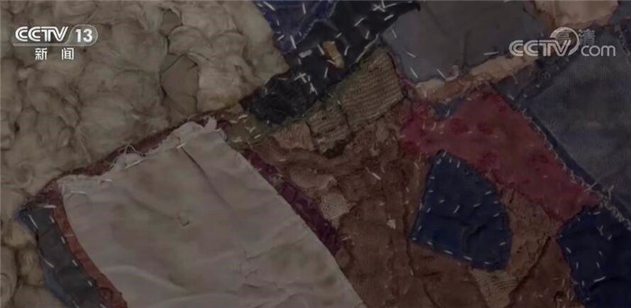 我们再来看这件大衣,羊皮破了补上棉布,棉布破了垫上纱布。黑的摞红的、白的摞灰的,补了又破、破了再补。在这块巴掌大小的地方,我们数了数,足足有十五块补丁,摞了四、五层。但老人说,就是这样打满补丁的衣服,战士们平时也舍不得穿。