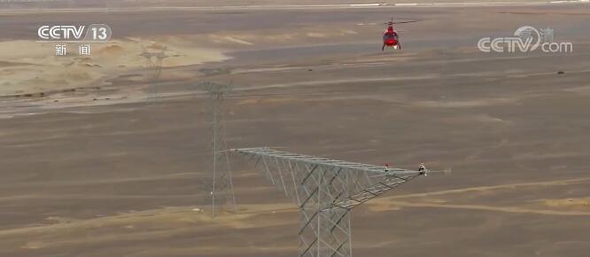 记者:我现在正乘坐的直升机飞行在新疆哈密市市郊的一片戈壁滩上。这片戈壁十分干旱、寸草不生,就是在这样一片戈壁荒原上,四条疆电外送大通道横跨而过,这里也是新疆“能源空中走 电送全中国”的重要的地理节点。现在,直升机不断下降高度,透过侧窗我们可以看到在不远处的输电铁塔下方黄色的电力检修车小的像一个火柴盒,顺着铁塔向上看,位于铁塔接近顶端位置有两个小点,他们应该就是此刻正在高空作业的电力工人。
