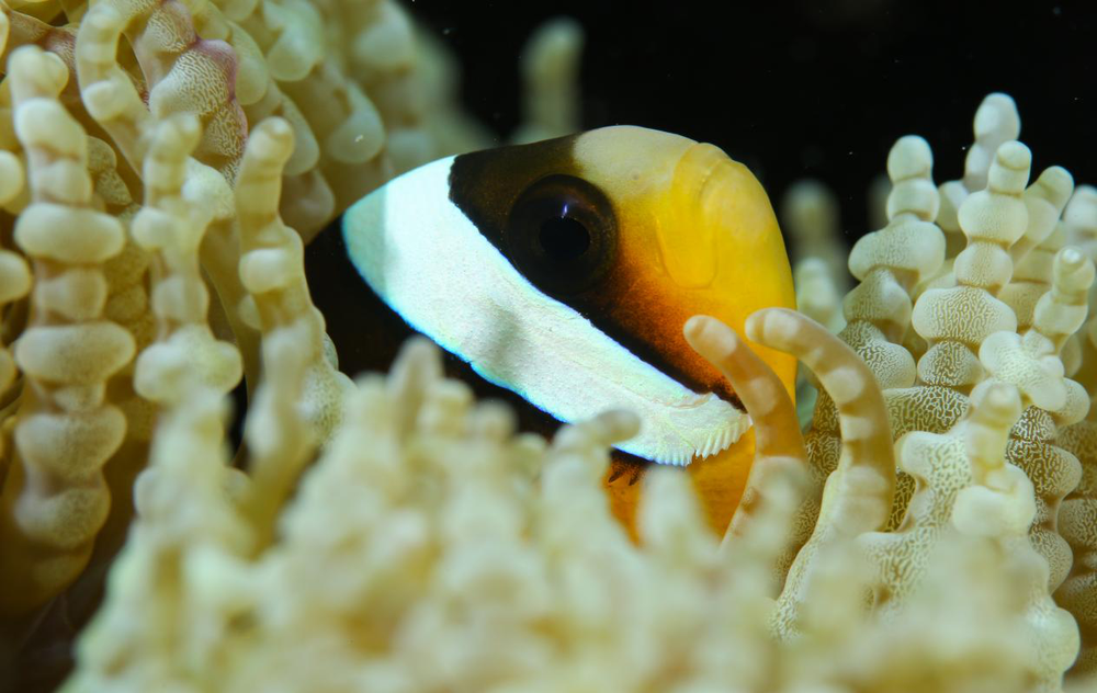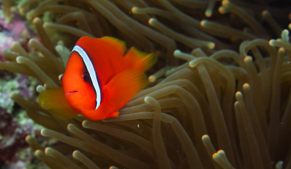 ↑ 蜈支洲岛海域海洋牧场中藏身于海葵内的小丑鱼