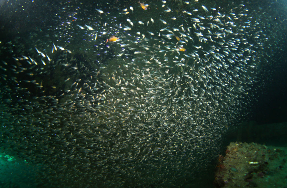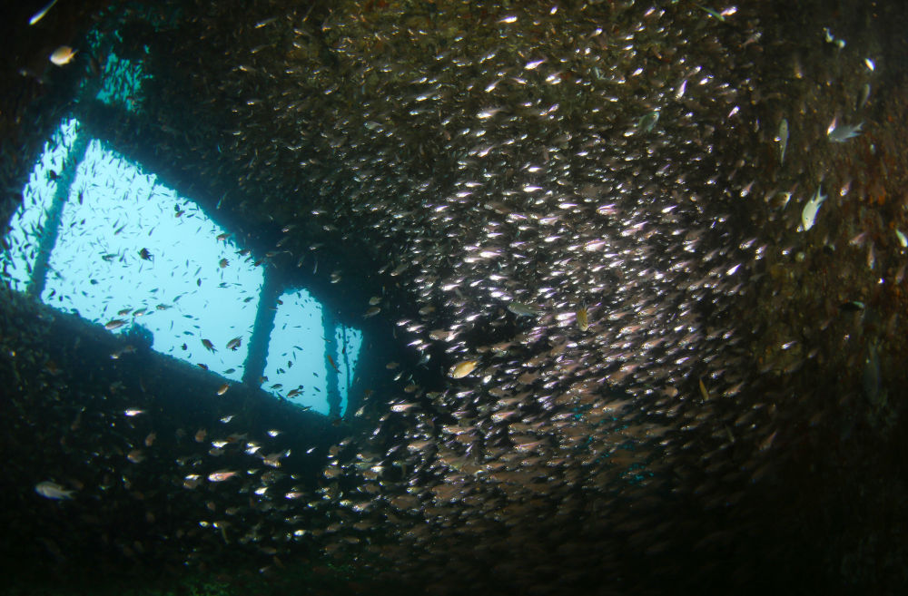 ↑ 蜈支洲岛海域海洋牧场沉船鱼礁内的鱼群