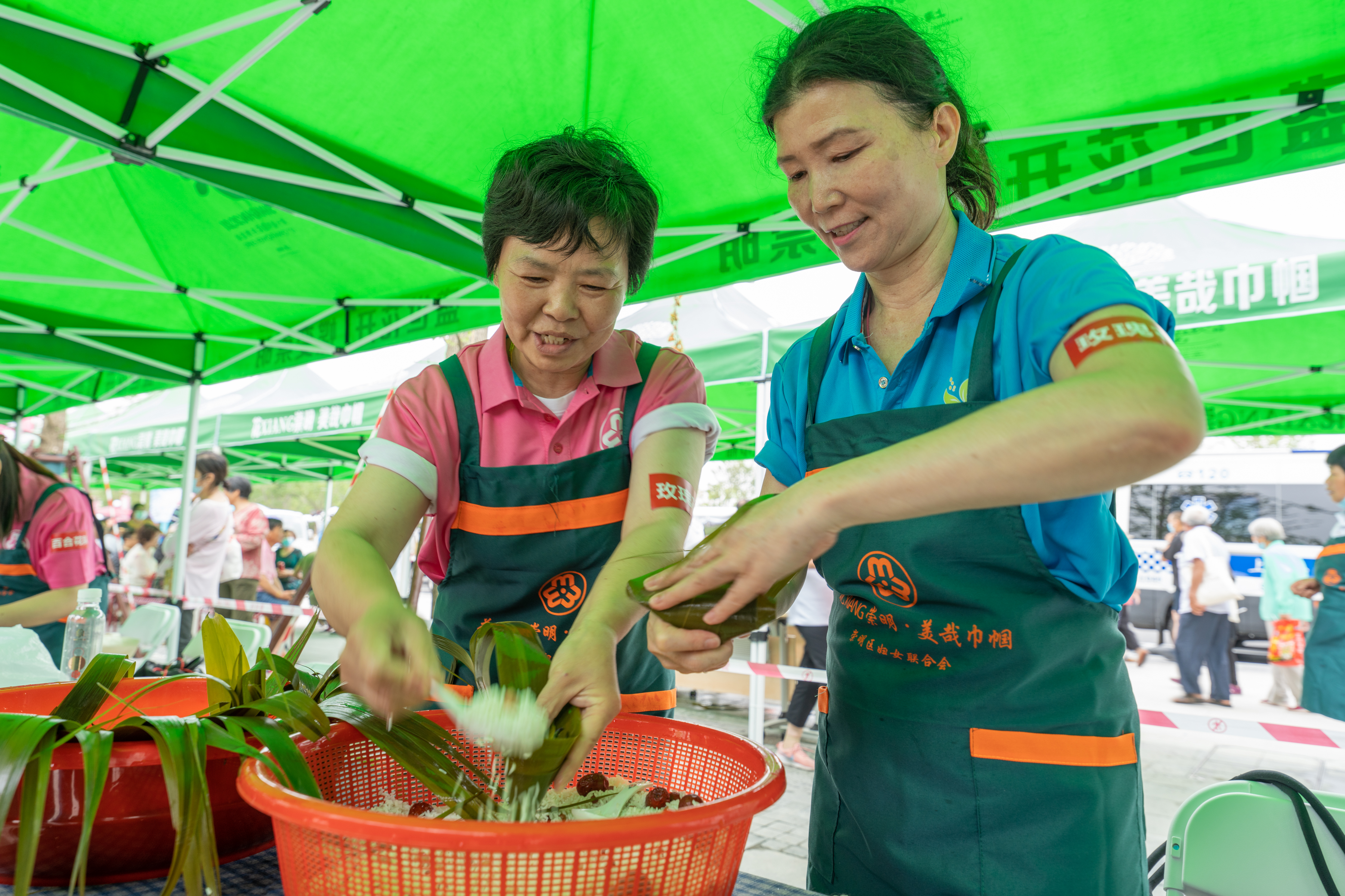 花博会展期内恰逢端午节。崇明将连续多年举办的沪台包粽友谊赛“搬”到了花博园区复兴广场,邀来两岸女同胞共度佳节、同赏美景。(徐平摄 新华社发)