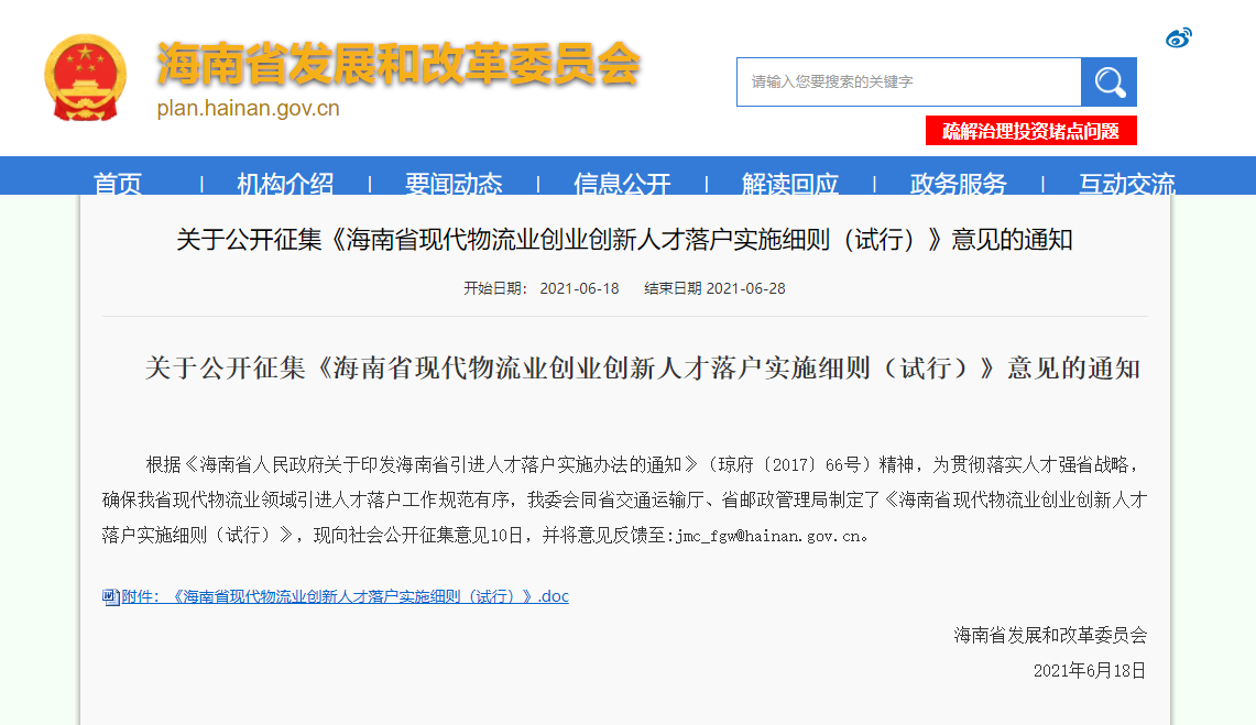 记者从海南省发改委了解到,为贯彻落实人才强省战略,确保海南现代物流业领域引进人才落户工作规范有序,海南省发改委会同省交通运输厅、省邮政管理局制定了《海南省现代物流业创业创新人才落户实施细则(试行)》(下称《细则》),即日起面向社会公开征集意见。