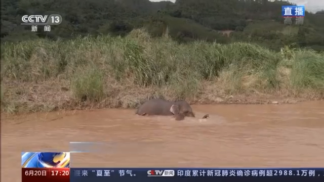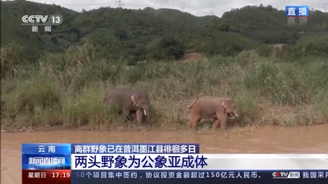 总台央视记者 杨潇:可能大家都会奇怪我为什么会站在这个江边,因为我现在是在云南的普洱市,在我身后一二百米处,两头大象正在田边悠闲地散步。就在咱们直播连线前10分钟,它们还在这条江里泡着,洗了一个特别畅快的澡以后又下来了,可能是没洗高兴、尽兴。自从它们4月份返回了以后,一直在墨江县停留,偶尔会回来到河这边,河这边是普洱的宁洱县,它们就在这两县交界的地方来回穿梭,那么最近到墨江县是13日,在这里停留了相对较长的一段时间。大家可以看到这两头小象在吃草,其实就在我们来的这一个小时的时间里边,这是它们第二次洗澡了,我们刚来的时候它们已经洗过一回了,洗完之后可能是饿了,两头小象就又返回田地,在农户家的芭蕉和玉米地里饱餐了一顿之后,我们想它们是不是要休息了,没想到它们又下来洗澡了,然后泡了有10分钟,现在又上岸,好像还不太愿意走,为什么这两头象会对水这么热诚?实际上这两头象是亚洲象的亚成体,一头象大概目测年龄在10岁左右,另外一头象是8岁左右。那么这两头象按道理来说不应该脱离象群独自生活,但是,林业局的专业技术人员分析以后说,可能这两个象像人类的这个青春期一样,它们现在到了叛逆期,就不想在家族里待着,就想出来闯荡闯荡世界,所以它们从4月份返回之后,在普洱这个地方就一直悠闲地这么过着哥俩好的小日子。那么我们也看到了,它们现在还在水边好好地冲澡。