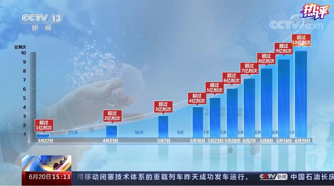从3月27日接种量超过1亿剂次,到4月21日超过2亿剂次,这个增加的1亿剂次用了25天。随后疫苗接种速度不断加快,从2亿到超过3亿剂次用时16天,从3亿剂次到突破4亿剂次用了9天,从4亿剂次到5亿剂次则用了7天,而从9亿次到10亿次,只用了5天时间,日均接种量超过2000万剂次。疫苗接种“加速跑”,再一次向世人展现了疫苗接种的中国速度。