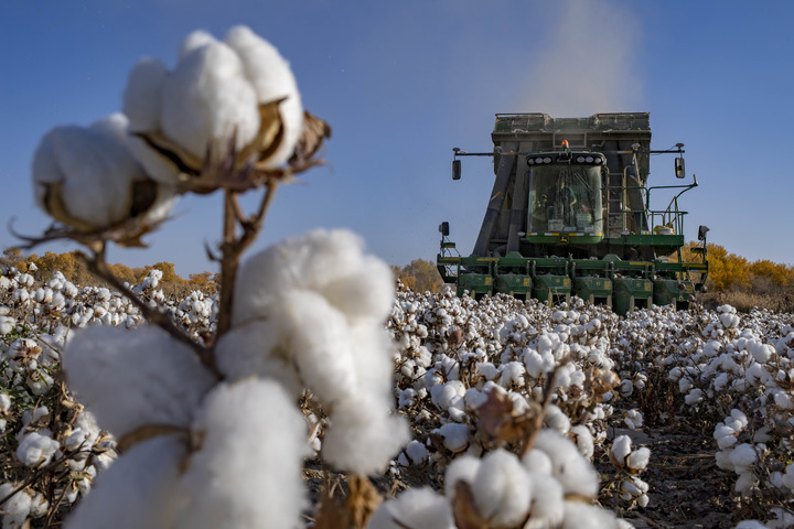 (图片说明)新华社照片,采棉机在新疆阿克苏地区沙雅县的一处棉田进行采收作业(2020年10月23日摄)