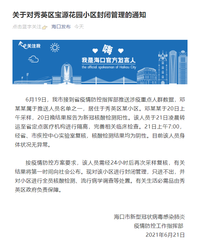 据海口发布微信公众号消息,6月19日,海口市接到省疫情防控指挥部推送涉疫重点人群数据,邓某某属于推送人员名单之一,居住于秀英区某小区。邓某某于20日上午采样,20日晚结果报告为新冠核酸检测阳性。该人员于21日凌晨转运至省定点医疗机构进行隔离,完善相关临床检查。21日上午7:00,经省、市疾控中心实验室复核,核酸检测结果均为阴性。目前该人员身体状况无异常。