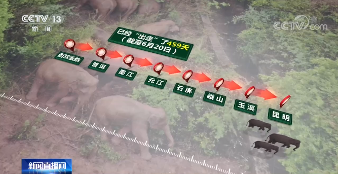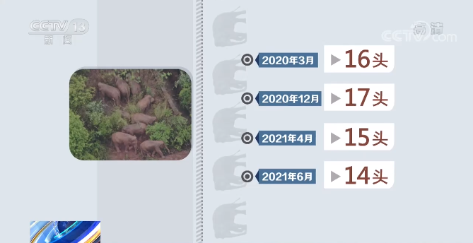 我们出发时,团队里有16头大象;2020年12月,1头小象降生在了普洱墨江县,团员数量增加到17头;今年4月份,有2头南下,回老家了;6月初,又有1头闹情绪,去了昆明市晋宁区,目前剩下14头。