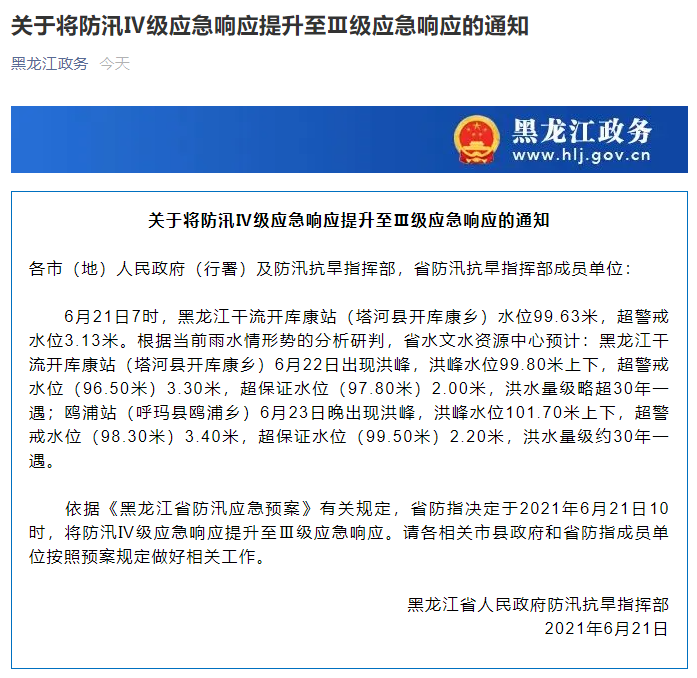 据“黑龙江政务”微信公众号,依据《黑龙江省防汛应急预案》有关规定,黑龙江省人民政府防汛抗旱指挥部决定于2021年6月21日10时,将防汛Ⅳ级应急响应提升至Ⅲ级应急响应。