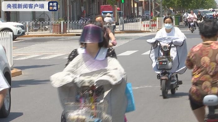 6月21日下午两点,河北邢台南和区出现了39℃的高温天气,在城区出行的人们,戴着遮阳帽、穿着防晒服来抵御高温。