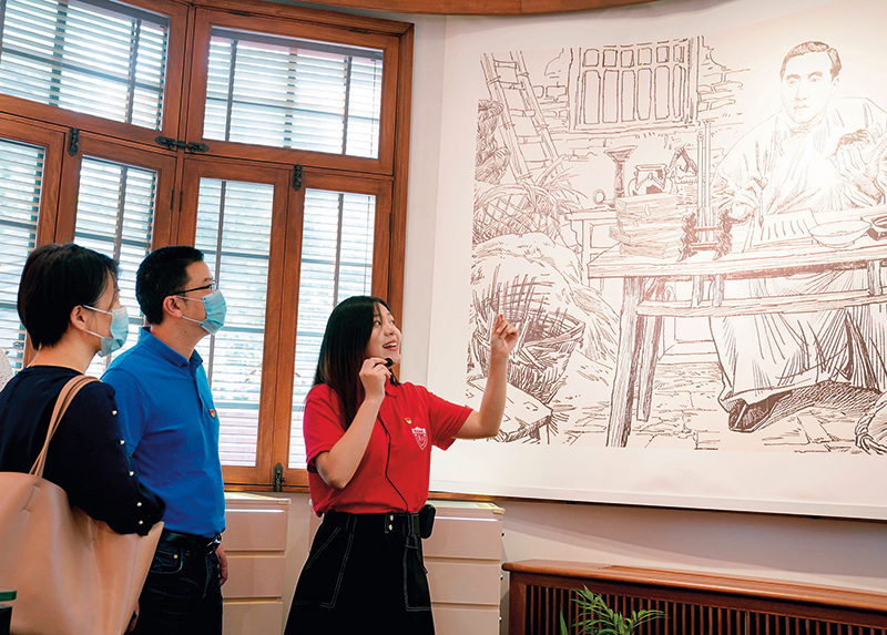 复旦大学《共产党宣言》展示馆党员志愿服务队队员、复旦大学马克思主义学院博士生陆婷婷(右)在为观众讲解(2020年6月 30日摄) 刘颖摄/本刊