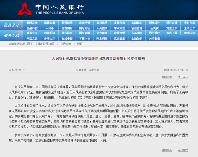 央视网消息:据人民银行网站公告,为深入贯彻党中央、国务院有关决策部署,落实国务院金融委第五十一次全体会议精神,打击比特币等虚拟货币交易炒作行为,保护人民群众财产安全,维护金融安全和稳定,近日人民银行有关部门就银行和支付机构为虚拟货币交易炒作提供服务问题,约谈了工商银行、农业银行、建设银行、邮储银行、兴业银行和支付宝(中国)网络技术有限公司等部分银行和支付机构。