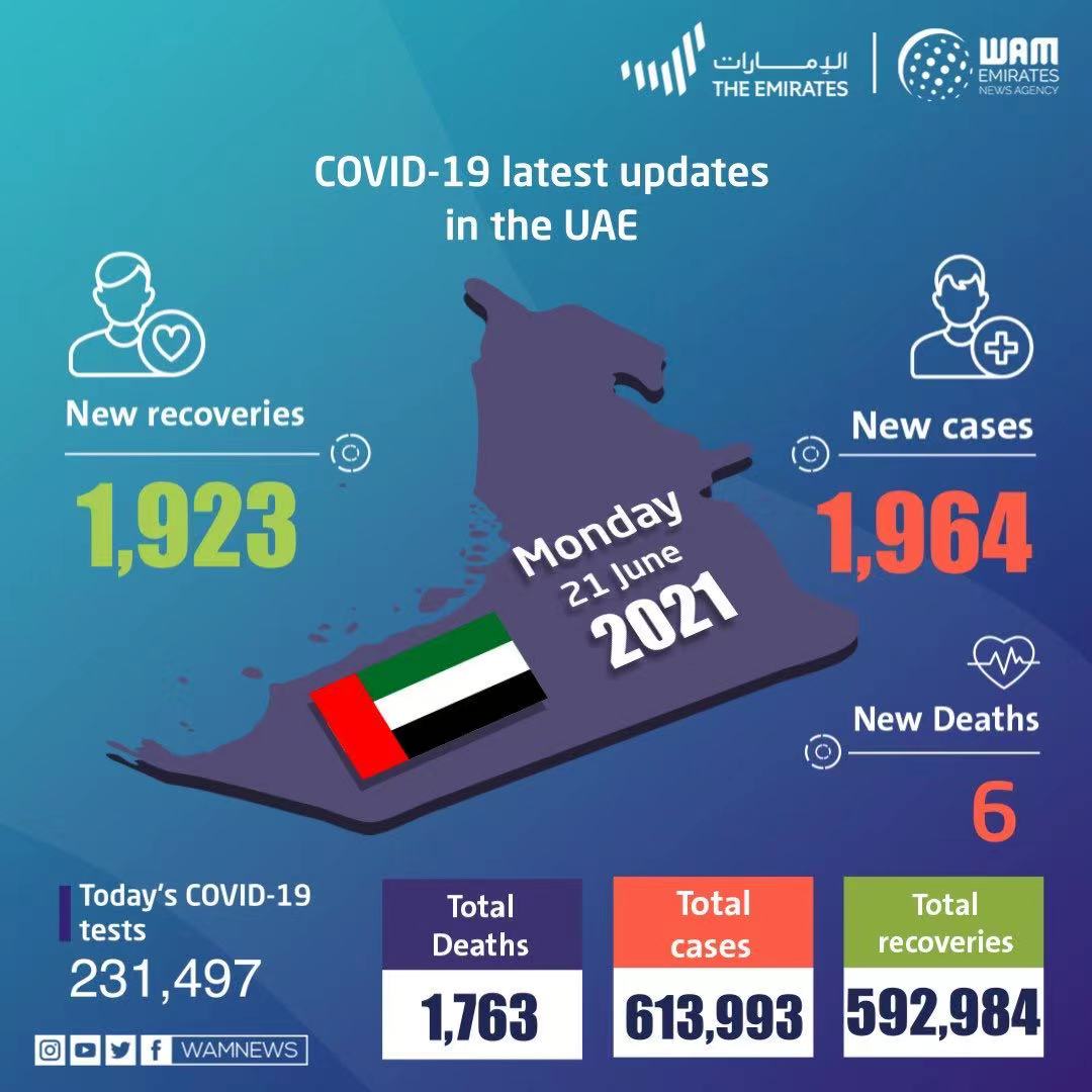 阿联酋卫生与预防部当地时间6月21日公布数据显示,阿联酋当天新增新冠肺炎确诊病例1964例,另外新增治愈病例1923例,新增死亡病例6例。截至目前,阿联酋累计确诊病例613993例,累计治愈592984例,累计死亡1763例。