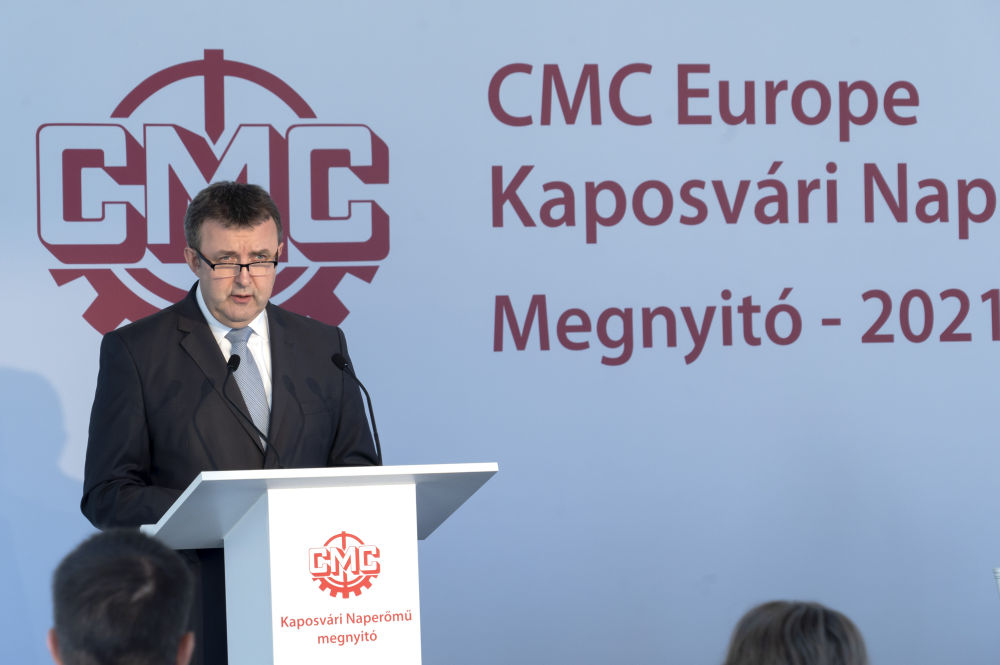 5月27日,由中国通用技术集团所属中国机械进出口(集团)有限公司(中机公司)投资兴建的匈牙利考波什堡100兆瓦光伏电站项目在考波什堡市举行投运启动仪式。图为匈牙利创新与科技部部长帕尔科维奇在考波什堡市项目现场致辞。新华社发(弗尔季·奥蒂洛摄)