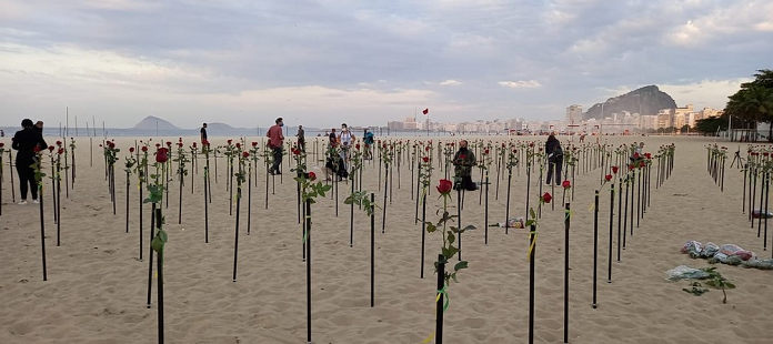 此前,当地时间19日,在包括首都巴西利亚在内的27个城市,成千上万民众走上街头,表达对联邦政府在疫情期间实施的措施的不满,呼吁加快疫苗接种速度。20日,里约民众在著名的科帕卡帕纳海滩遍插玫瑰,纪念因新冠肺炎去世的亲人。