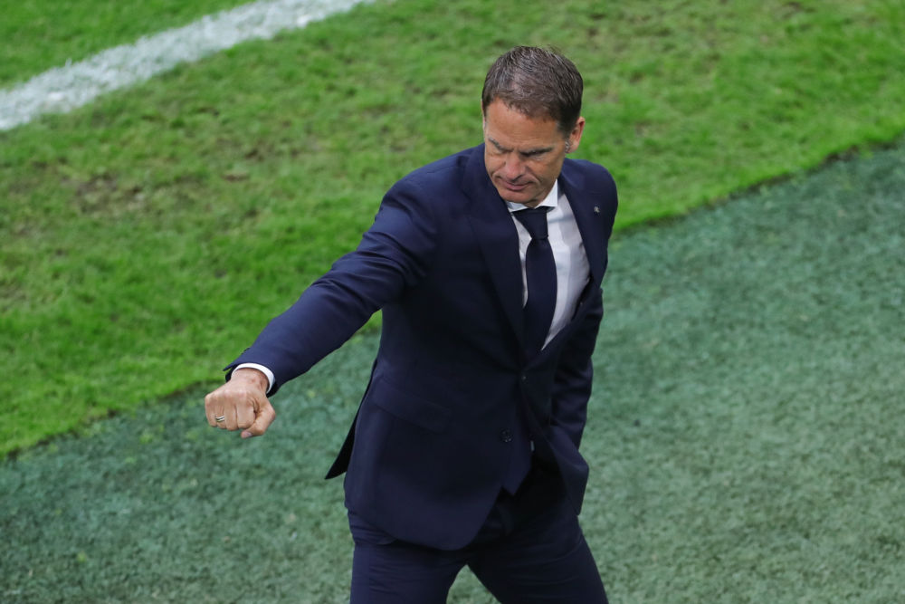 ↑荷兰队主教练弗兰克·德波尔在赛后庆祝胜利。
