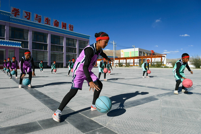 阿里革吉县完全小学学生在进行篮球训练