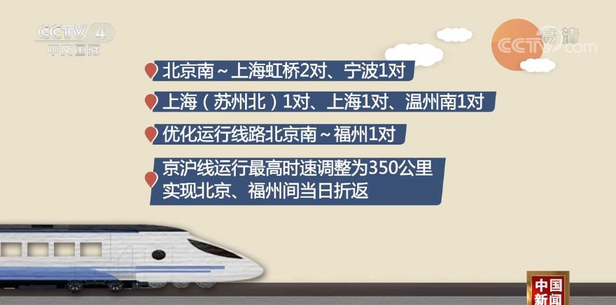 新列车运行图实施后,京沪高铁将新增6对最高时速350公里复兴号标准动车组,分别为:北京南—上海虹桥2对、宁波1对;上海(苏州北)1对、上海1对、温州南1对;此外,优化运行线路北京南—福州1对,京沪线运行最高时速调整为350公里,实现北京、福州间当日折返。