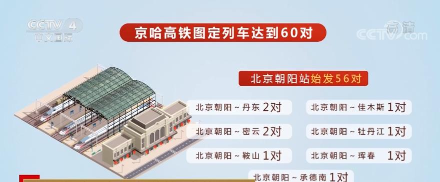 京哈高铁图定列车达到60对,其中北京站始发4对,分别为:北京—沈阳北、哈尔滨西、吉林、承德南各1对。北京朝阳站始发56对,具体为:北京朝阳—沈阳12对、哈尔滨11对、赤峰10对、长春7对、吉林4对、通辽3对、丹东和密云各2对;至鞍山、佳木斯、牡丹江、珲春和承德南各1对。今后,不仅北京站结束了没有“G”字头动车组始发终到的历史,同时北京六大火车站也同步开启高铁复兴新时代。