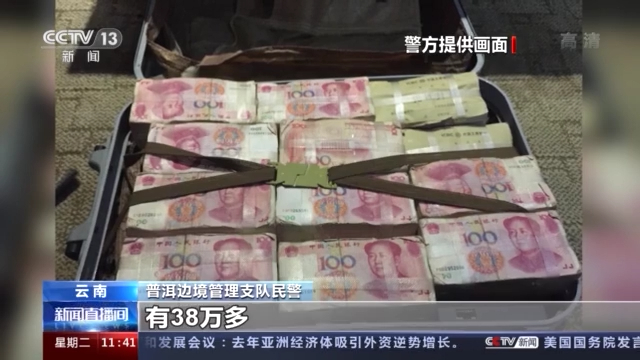 普洱边境管理支队 民警:当时我们过去后,发现男子就坐在路边,神情比较慌张。他携带了一个行李箱,我们检查后发现行李箱内装了大量现金,有38万多。