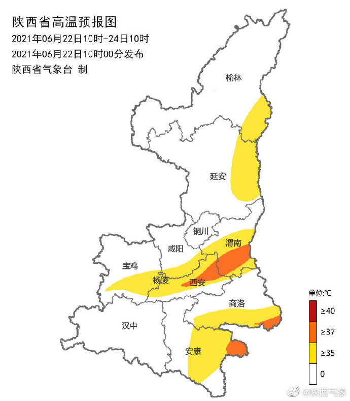 陕西省气象台2021年06月22日10时发布高温蓝色预警:受脊前西北气流控制,预计未来48小时,陕北东部、西安大部、宝鸡中部、渭南大部、咸阳南部、杨凌、安康东部、商洛南部有35℃及以上的高温天气,局地地方可达37℃以上。(总台记者 杨雨桐 耿晓斌)