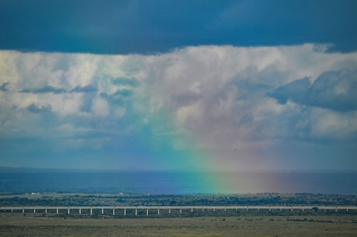 2020年4月29日在肯尼亚内罗毕拍摄的彩虹下的蒙内铁路。新华社发(李琰摄)