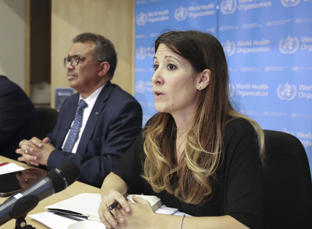 2020年3月5日,在瑞士日内瓦,世界卫生组织卫生紧急项目技术负责人玛丽亚·范凯尔克霍弗(右)在例行记者会上发言。(新华社记者陈俊侠摄)
