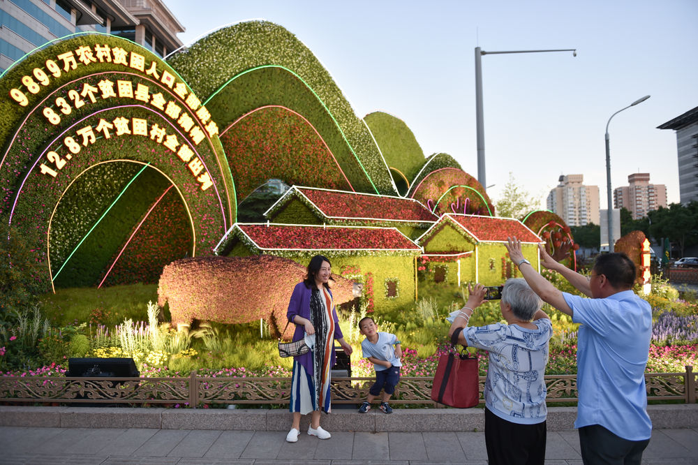 6月19日,市民游客在位于北京西单东南角的“全面小康”花坛前拍照留念。新华社记者 陈钟昊