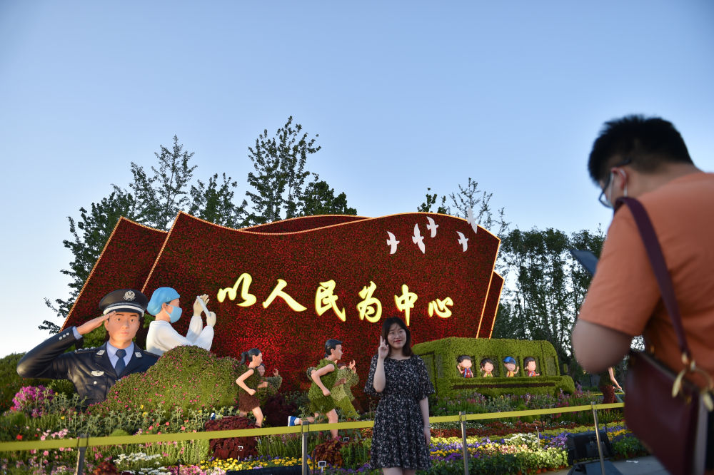 6月19日,市民在位于北京西单东北角的“人民至上”花坛前拍照留念。新华社记者 陈钟昊 摄
