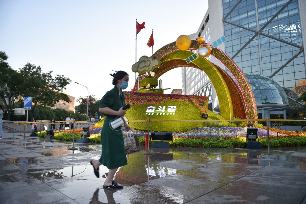6月19日,行人经过位于北京西单西北角的“创新发展”花坛。新华社记者 陈钟昊 摄