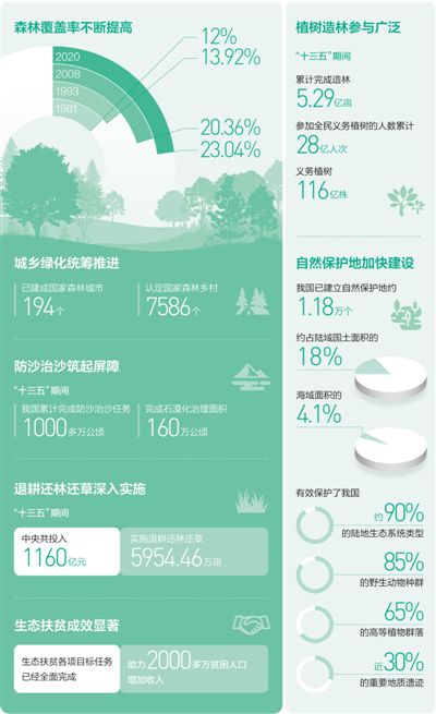 一片片荒原变绿,一个个沙丘止步,一座座青山连绵起伏。从森林匮乏到人工林面积世界第一,从“沙进人退”到“绿进沙退”,神州大地不断绿起来美起来,城乡人居环境不断改善。