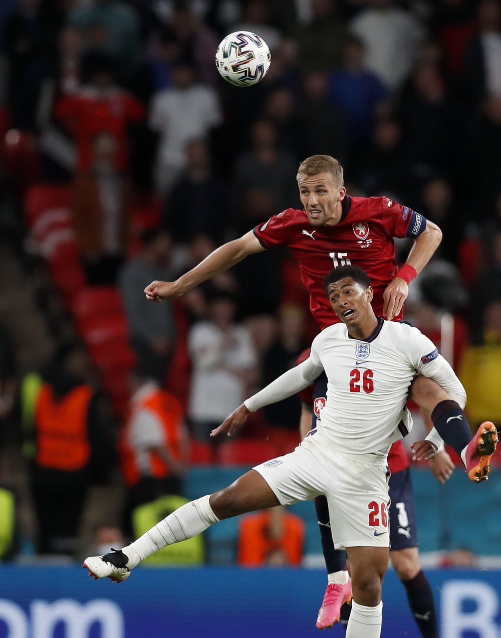 ↑英格兰队球员贝林哈姆(下)与捷克队球员绍切克拼抢。