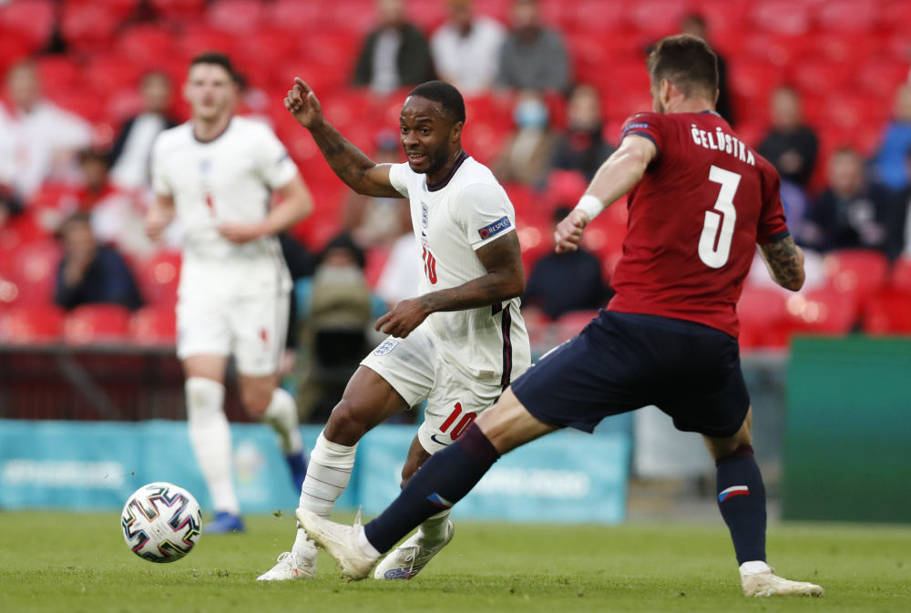 ↑英格兰队球员斯特林(中)与捷克队球员切卢斯特卡(右)拼抢。