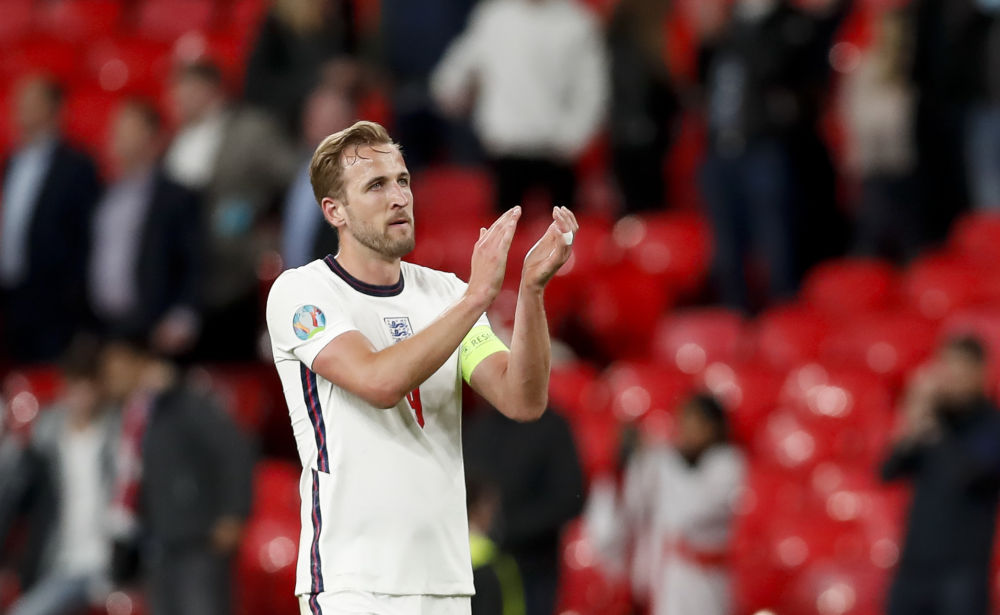 ↑英格兰队球员凯恩在赛后向观众致意。