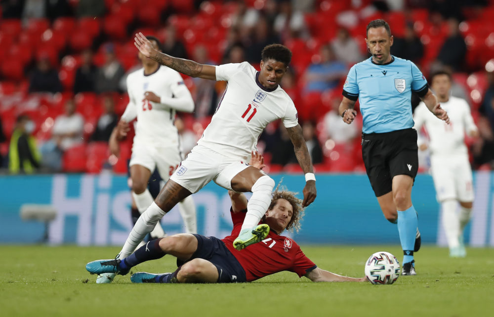 ↑英格兰队球员拉什福德(前左)与捷克队球员克拉尔(下)拼抢。