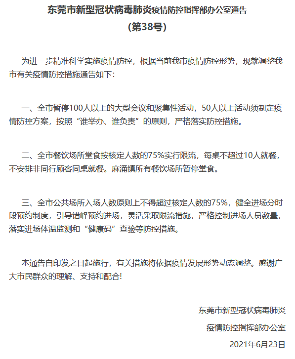 一、东莞市暂停100人以上的大型会议和聚集性活动,50人以上活动须制定疫情防控方案,按照“谁举办、谁负责”的原则,严格落实防控措施。