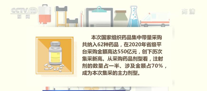 本次国家组织药品集中带量采购共纳入62种药品,在2020年省级平台采购金额高达550亿元,创下历次集采新高。从采购药品剂型看,注射剂的数量占一半、涉及金额占70%,成为本次集采的主力剂型。本次集采品种覆盖高血压、冠心病、糖尿病、抗过敏、抗感染、消化道疾病等常见病、慢性病用药,以及肺癌、乳腺癌、结直肠癌等重大疾病用药。