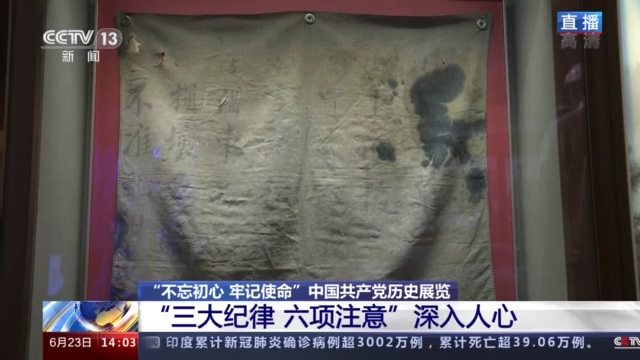 总台央视记者 刘峰:这是井冈山斗争时期红军战士用的一件包袱皮,与众不同的是它写满了字,只是因为时间的关系,上面的字迹非常模糊了,但是我们依稀能看到这里写的“借东西要还”,这就是我们今天非常熟悉的“三大纪律、六项注意”。