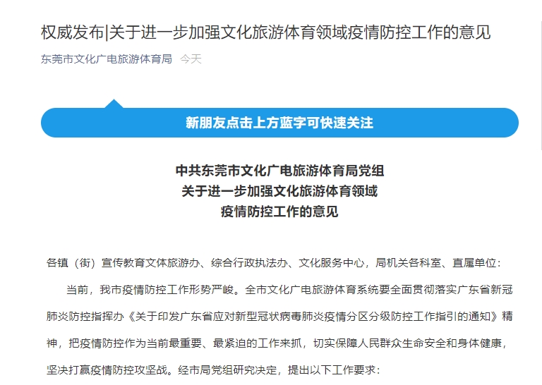 央视网消息:据东莞市文化广电旅游体育局,《中共东莞市文化广电旅游体育局党组关于进一步加强文化旅游体育领域疫情防控工作的意见》(下简称《意见》)已印发,明确分级防控,织密疫情防控工作安全网。