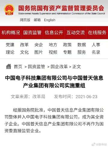 【#中国普天整体并入中国电科#】中央企业重组整合再下一城!国务院国资委网站23日发布消息,经报国务院批准,中国普天信息产业集团有限公司整体并入中国电子科技集团有限公司,成为其全资子企业。中国普天信息产业集团有限公司不再作为国资委直接监管企业。(记者王希)