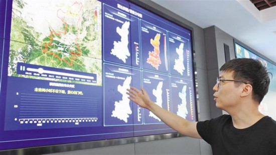 十四运会和残特奥会气象台工作人员向记者介绍陕西省气象雷达实时反馈情况。