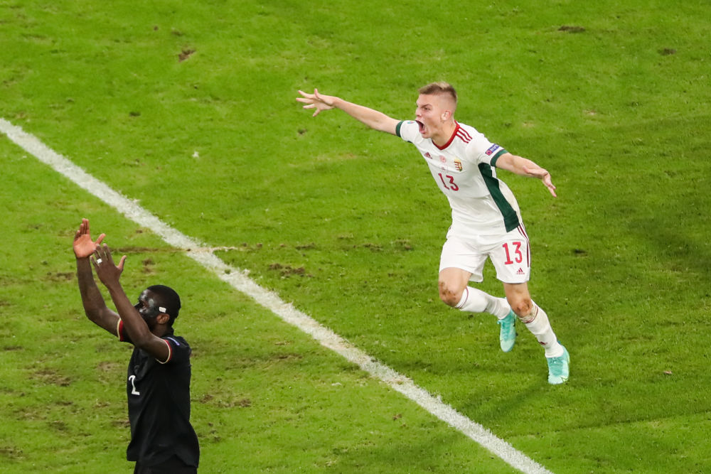 ↑匈牙利队球员舍费尔(右)在比赛中庆祝进球。