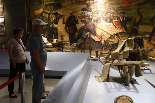 2019年6月9日,游客在孟良崮战役纪念馆内参观孟良崮战役期间使用过的小推车。新华社记者 王凯 摄
