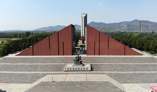 游客在孟良崮战役纪念馆参观(2019年6月9日无人机拍摄)。 新华社记者 王凯 摄