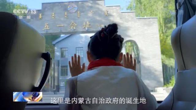 导游:同学们,我们的右手边是五一大会的会址。这里是内蒙古自治政府的诞生地,见证了在中国共产党的领导下,民族区域自治制度在内蒙古的成功实践。