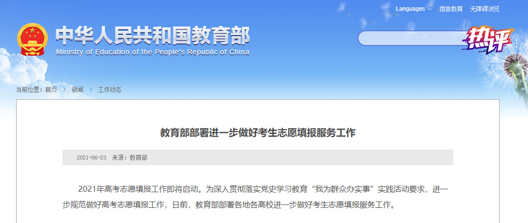 6月23日起,各地高考陆续“放榜”,考生志愿填报受到高度关注。教育部23日发布通知,部署各地各高校进一步做好考生志愿填报服务工作。各地要精心组织实施“五个一”志愿填报咨询服务活动,即至少开展一次覆盖全体师生的志愿填报政策培训、提供一本志愿填报指导材料、组织一场线上直播咨询活动、播出一档电视或电台政策宣讲节目、发布一期志愿填报预警信息。