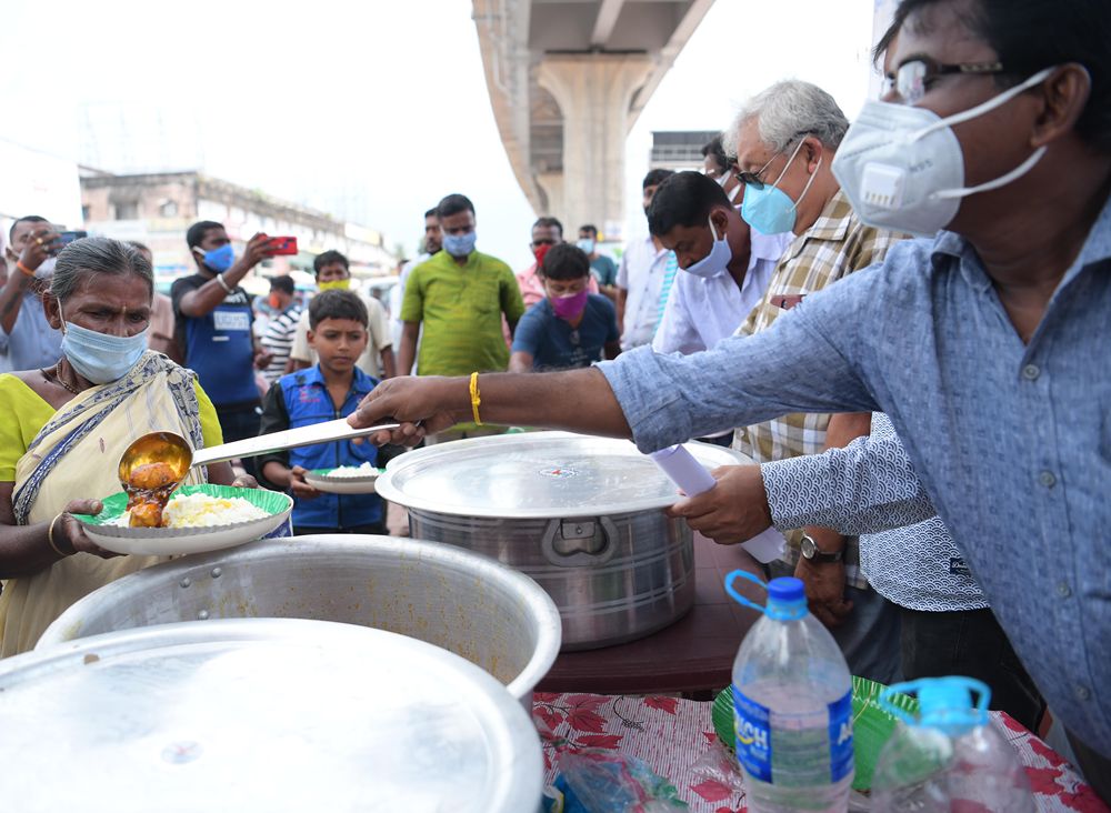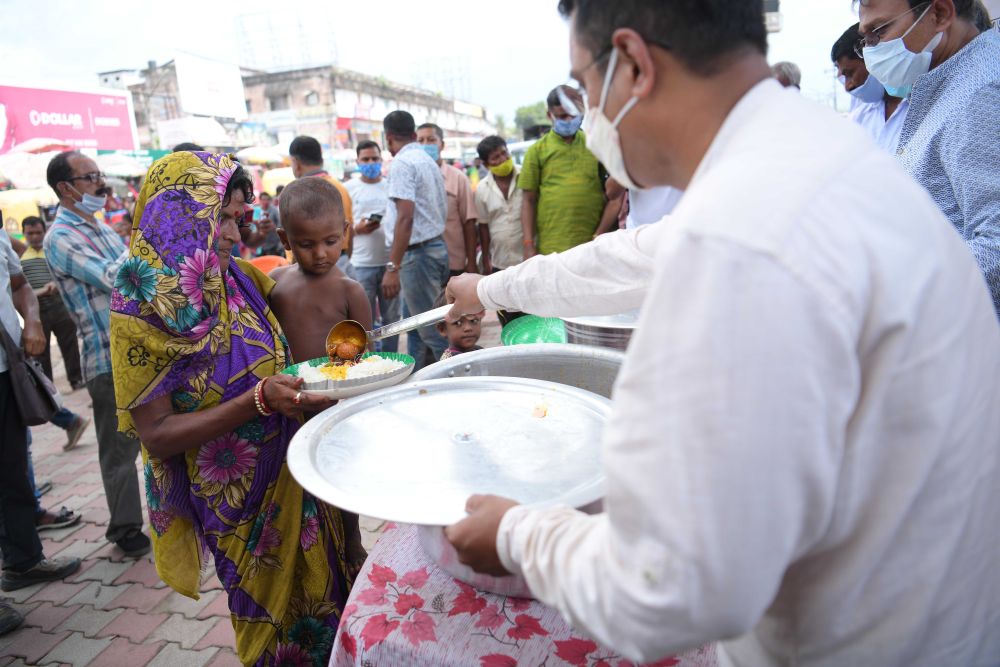 6月23日,志愿者在印度阿加尔塔拉封锁期间为人们分发食物。新华社发