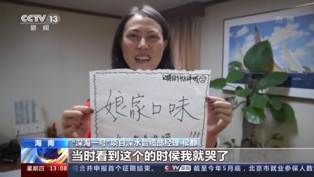 “深海一号”项目深水管缆部经理 侯静:我在外租船工作已经4天没有水果青菜了,287船给我送的吃的里面加了这样一张纸,写了“娘家口味,记得给个好评”。