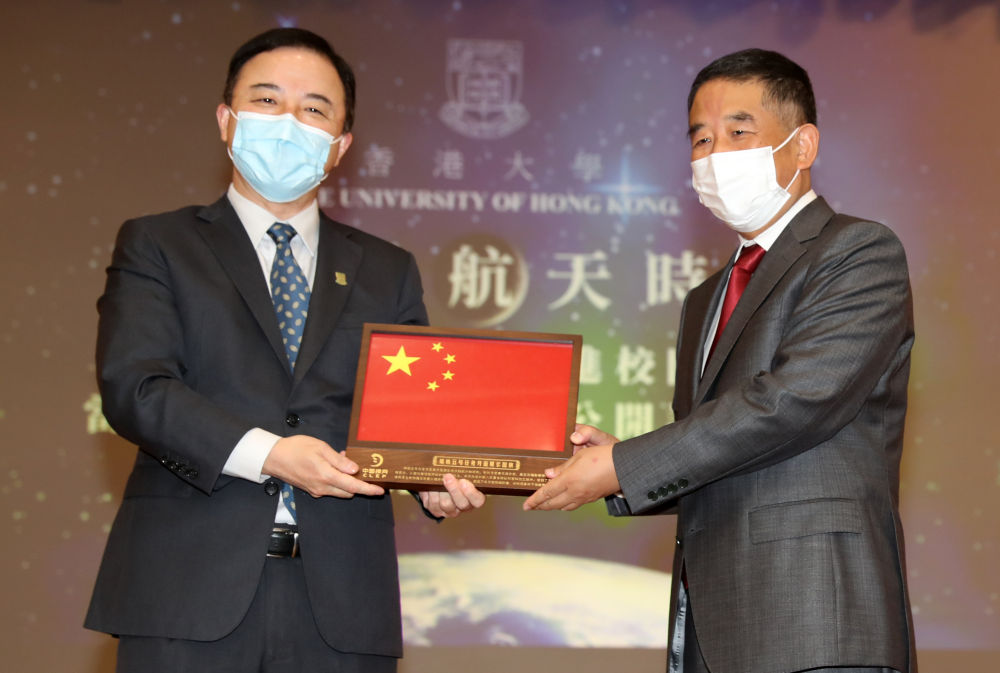 6月23日,中国探月工程三期总设计师胡浩(右)向香港大学赠送国旗,这面国旗与嫦娥五号探测器在月球上展示的一模一样。新华社记者 李钢 摄